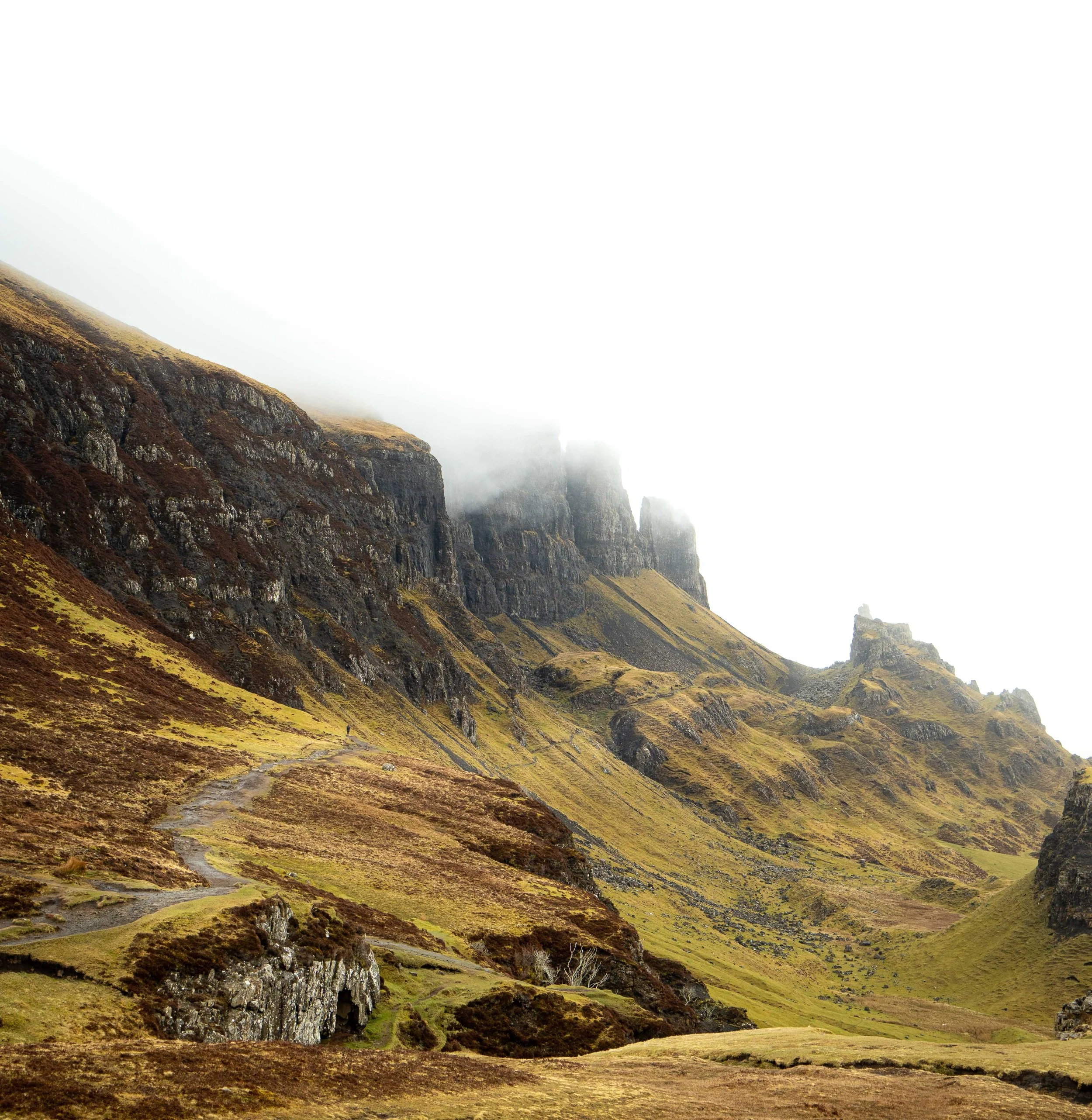 Well in this case the early bird gets the solid views and unoccupied tracks. (Highly recommend the pain staking early start for this one) Departing the car park you are met with sharp volcanic edges and a winding valley single track that leads deep into the heart of The Quiraing. The name Quiraing comes from Old Norse “Kvi Rand”, meaning “Round Fold” and it is said the locals would keep livestock in the fold of the mountains away from ravaging Norse invaders.